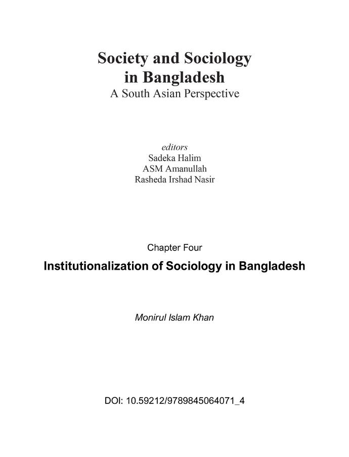 Khan, Monirul Islam, AU. Institutionalization of Sociology in Bangladesh. Society and Sociology in Bangladesh: A South Asian Perspective. Dhaka, Bangladesh. https://dx.doi.org/10.59212/9789845064071_4